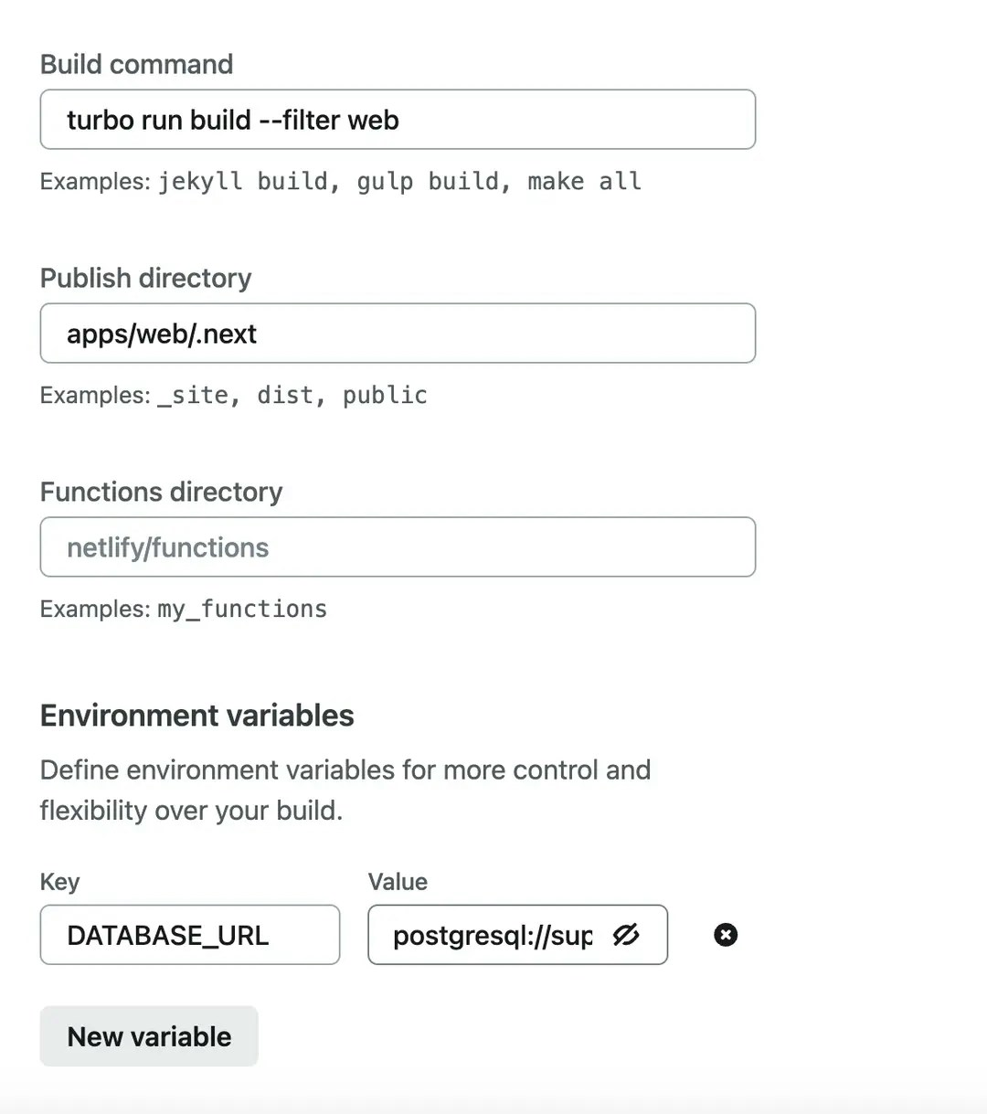 After selecting the repository, you will be promted to configure the build settings. Usually Netlify will detect the correct settings automatically. If not, you can configure them manually like in the screenshot below: